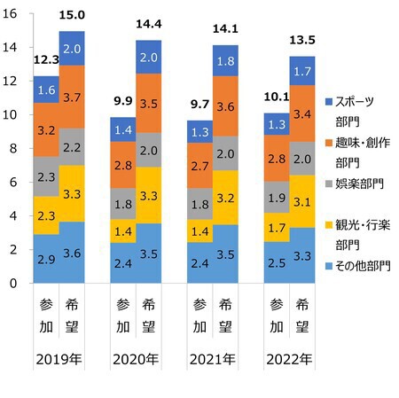 ・一人当たりの平均参加種目数は10.1種目となり、コロナ禍であった2020年(9.9種目)、2021年(9.7種目)よりわずかに増加したものの、2019年の水準(12.3種目)には届いていない。
