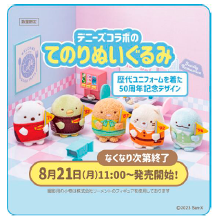 デニーズ50周年を記念して、過去のデニーズのユニフォームを着た「すみっコぐらしオリジナルてのりぬいぐるみ」を販売する。