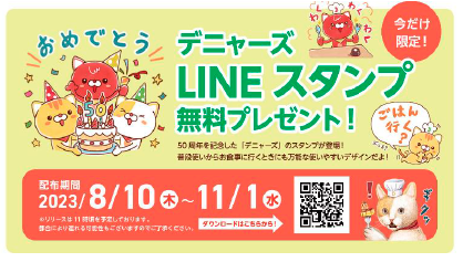 第4弾「デニャーズLINEスタンプ50周年バージョン」の配布デニーズ公式キャラクター「デニャーズ」のオリジナルLINEスタンプを配布する。