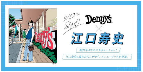 9月12日(火)よりメニューブック表紙に、イラストレーターの江口寿史さんの描き下ろしイラストを採用する。デニーズは1992~97年まで、メニューブックの表紙を江口寿史さんにデザインを依頼していた。江口寿史さんのイラストがデニーズのメニューブックの表紙を飾るのは約27年ぶりとなる。