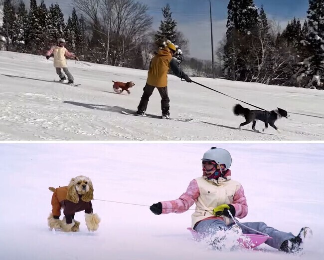 白馬乗鞍温泉スキー場。犬と一緒に雪遊び