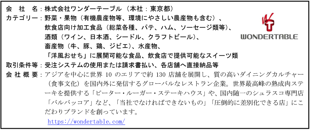 長野県及び(公財)長野県産業振興機構では、事業者の販路開拓の機会を確保し、県産品の販路拡大を支援するため、標記Web商談会を随時開催している。 この度下記のとおり買い手事業者(バイヤー)ワンダーテーブルとの商談を希望する事業者を募集する。「販路開拓をお考えの皆様は是非この機会をご活用下さい」と話している。