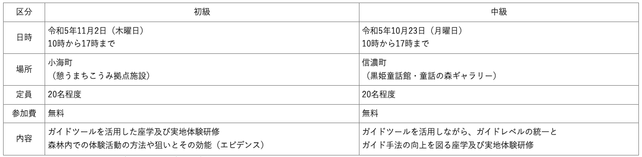 日時は初級が令和5年11月2日(木)10時から17時まで、中級が令和5年10月23日(月)10時から17時まで。講座運営は(株)さとゆめ(委託事業者)。講師は初級が森林メディカルトレーナーの河西 恒氏、中級が森林メディカルトレーナーの高力一浩氏。
