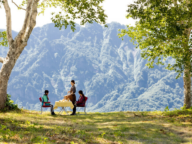 山頂にはデッキとイス、テーブルを用意している。山麓のシャルマン戸隠にて戸隠の野菜をふんだんに使ったオリジナルランチボックスの他、地元産の食材を使った軽食の販売を行う予定だ。山頂までお持ちいただき景色を楽しみながらのお食事をお召し上がり下さい。運行期間限定の特製ドリンクメニューも用意している(*食事風景写真は夏の景色)。