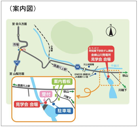 なお、事前申込みの必要はなく、直接会場へお越し下さい。※荒天等により中止する場合がある。中止の際はホームページ等に掲載する。会場は金峰山川発電所建設工事現場(川上村阿知端下砂防ダム隣接)。その他詳細は別紙をご覧下さい。