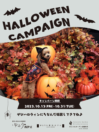 本キャンペーンの対象施設は「ゆとりろガーデン北軽井沢with DOGS」「ゆるり西伊豆」「ゆとりろ蓼科ホテルwith DOGS」の3施設。何れの施設も仮装してお越しいただいたわんちゃんにハロウィンにちなんだおやつをプレゼントする。昨年までは10月30、31日のみ施設によってプチイベントを実施していたが、3施設合同で約2週間に渡る開催は今回が初めてとなる。館内にはハロウィンにちなんだフォトスポットもあり、ワンちゃん×ハロウィンの可愛らしい姿をカメラにおさめることも可能だ。秋の行楽シーズン、イベントとともにわんちゃんとのご旅行を愉しんでみてはいかがでしょうか。