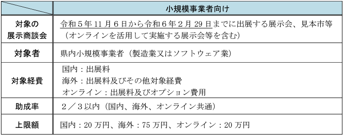 長野県及び(公財)長野県産業振興機構では、県内の小規模事業者の海外•国内マーケットにおける新市場開拓や販路拡大を支援するため、展示会等(オンラインを含む)に出展する際の費用の一部を助成する「小規模事業者販路開拓助成金」(下期分)の2次募集を行う。