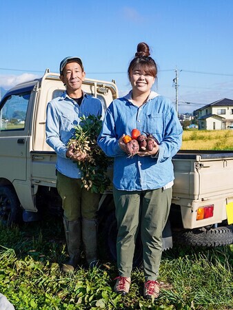 愛知県出身の康弘さんと安曇野市出身の久奈生さん。「自然と触れ合える農業を仕事にしたい」と東京都から移住。スーパーでは手に入らない珍しい野菜を中心に、約30品目を栽培。ECサイトでの購入も可能。