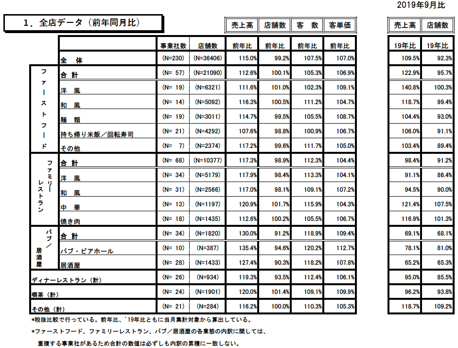 9月の全体概況は、FFでは洋風を中心に秋の季節メニュー商戦が活発で売上好調。他の業態も月後半や土日•祝日を中心に客足好調で、外食全体の売上げは115.0%、19年比では109.5%となった。インバウンド需要は引き続き堅調で、都心部•観光地を中心に外食の売上げ向上に寄与している。
