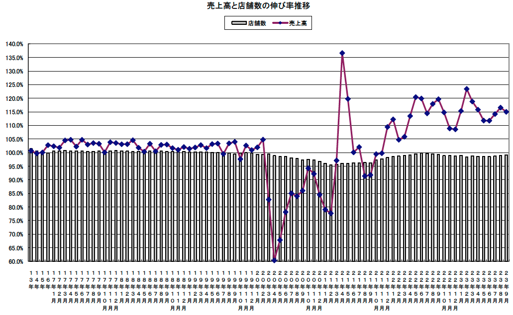 パブ•居酒屋業態の「パブ•居酒屋」は、月後半に比較的堅調に推移し、長引く残暑によりビール販売が好調だったこともあり、売上げは前年比130.0%、19年比69.1%となった。店舗数はコロナ前の7割近くにとどまっているが、店舗当たり売上げは回復基調にあり、一部の繁華街では低価格訴求型の店舗なども出現しはじめた。