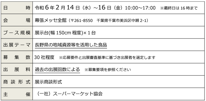 幕張メッセで開催される商談展示会の長野県パビリオンに出展する事業者を募集する。会場で は県内食品加工企業等の販路拡大と県産品の消費拡大を図るため、出展事業者と小売業及び卸商 社等との商談を支援する。