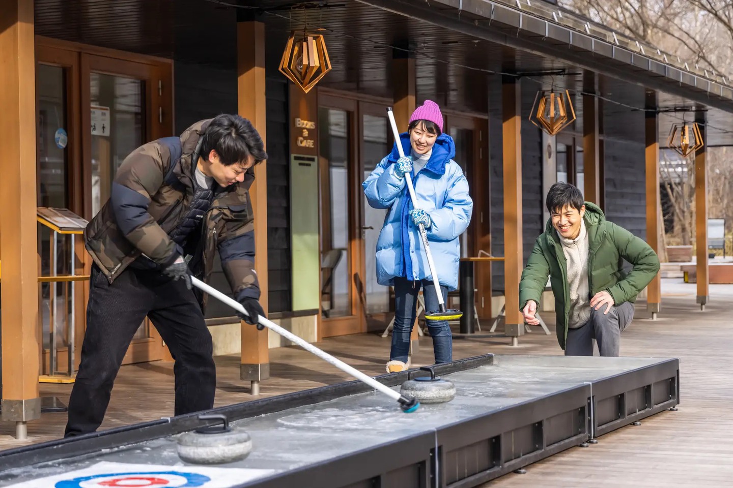 全長5mの特設アイスリンクにあるハウスを目掛けてストーンを滑らせ、ブラシでスイープする体験ができる。