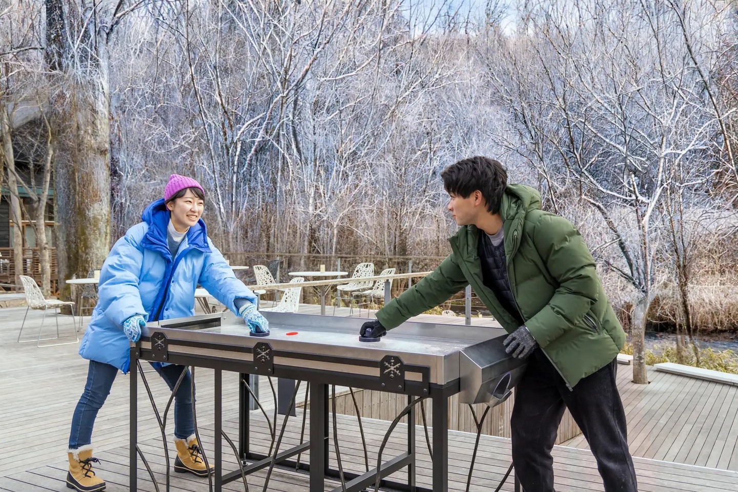 冬期の気温が低い軽井沢では、スキーやスケート、カーリングなどのウィンタースポーツが盛んだ。星野エリアにある「ケラ池スケートリンク」では、例年12月から2月にかけて、池の水が自然に凍る天然氷のエリアがオープンする。本イベントでは、スケートだけでなく寒さを楽しめる体験を提供したいと考え、春楡(ハルニレ)の木立に囲まれたハルニレテラスを開催場所とし、軽井沢の寒さを活かしたゲームを用意する。