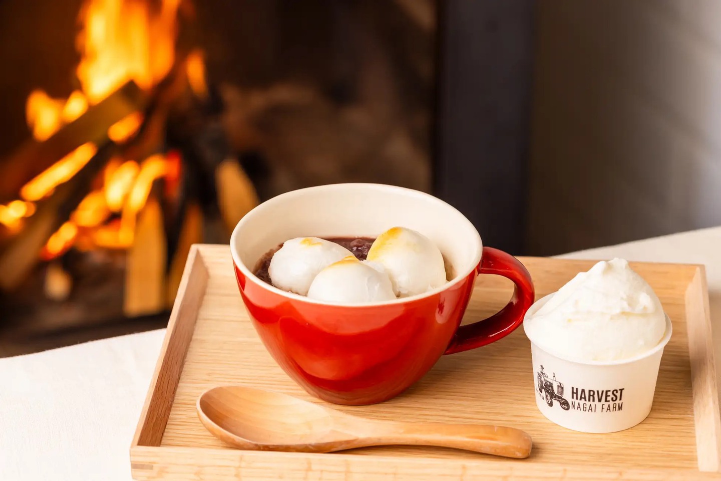 ハルニレテラス内の店舗では、冬季限定のドリンクやスイーツを販売する。ジェラート店「HARVEST NAGAIFARM」の「ぜんざい」は、丁寧に炊いた小豆となめらかな舌触りの農場のお餅が、冷たいジェラートとよく合う。甘いぜんざいとお餅が、寒い屋外で冷え切った身体を温める。