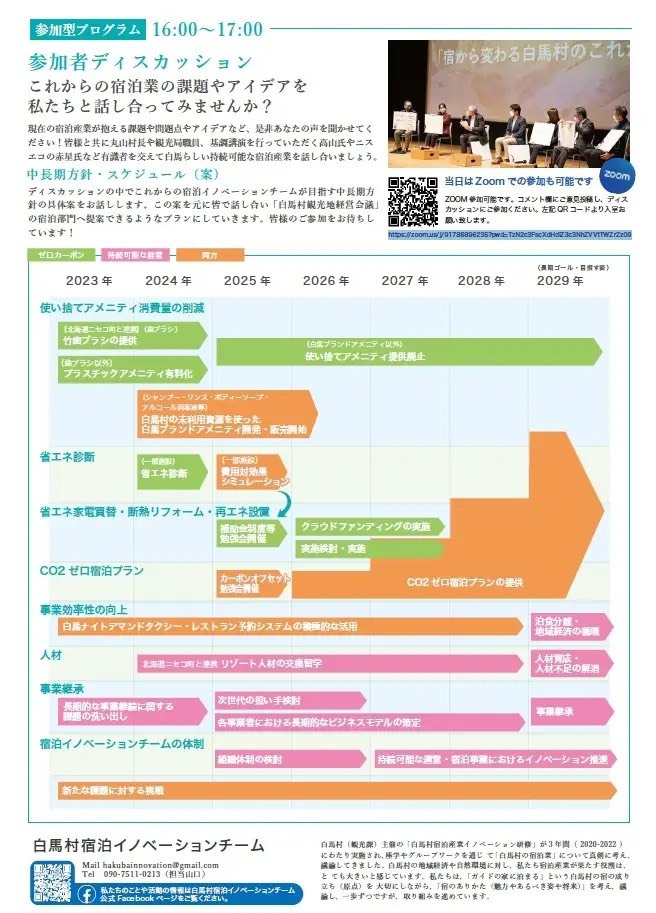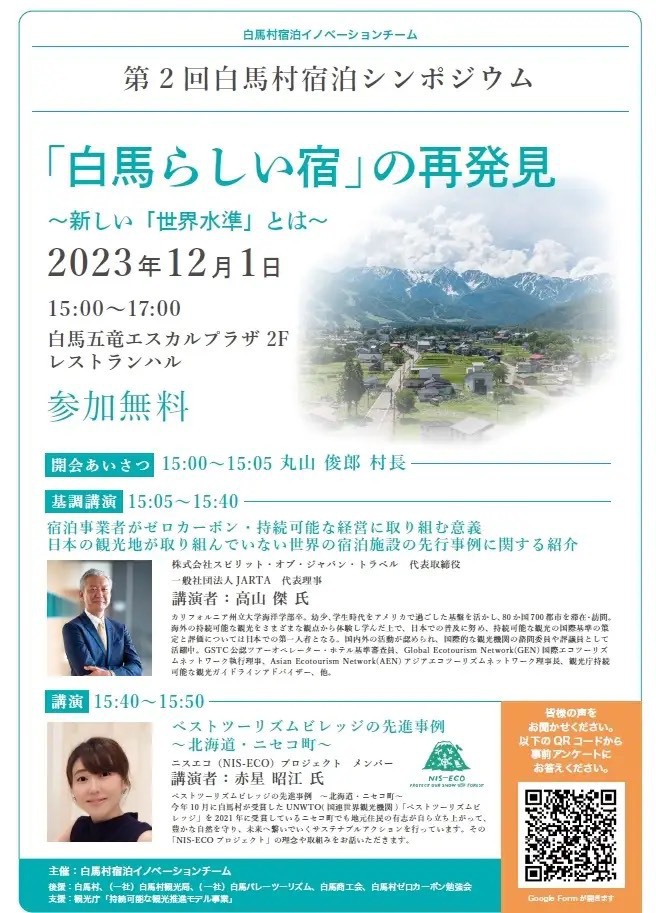 今回は持続可能な観光の策定•評価について日本の第一人者である高山傑さんと2021年に「ベストツーリズムビレッジ」を2021年度に受賞し、白馬と同じスノーリゾートとして有名な北海道•ニセコ町での民間レベルにおける持続可能か観光地へ取り組んでいる「NIS-ECOプロジェクト」の赤星昭江さんをお招きし、スノーリゾートにおける観光業のこれからのありかたやSDGsへの取組みについて講演いただき、その後参加者参加型のディスカッションでこれからの白馬の観光地としての位置づけを提言する。当日は白馬村会場でのリアル参加の他、zoomによるオンライン参加も可能となっている。