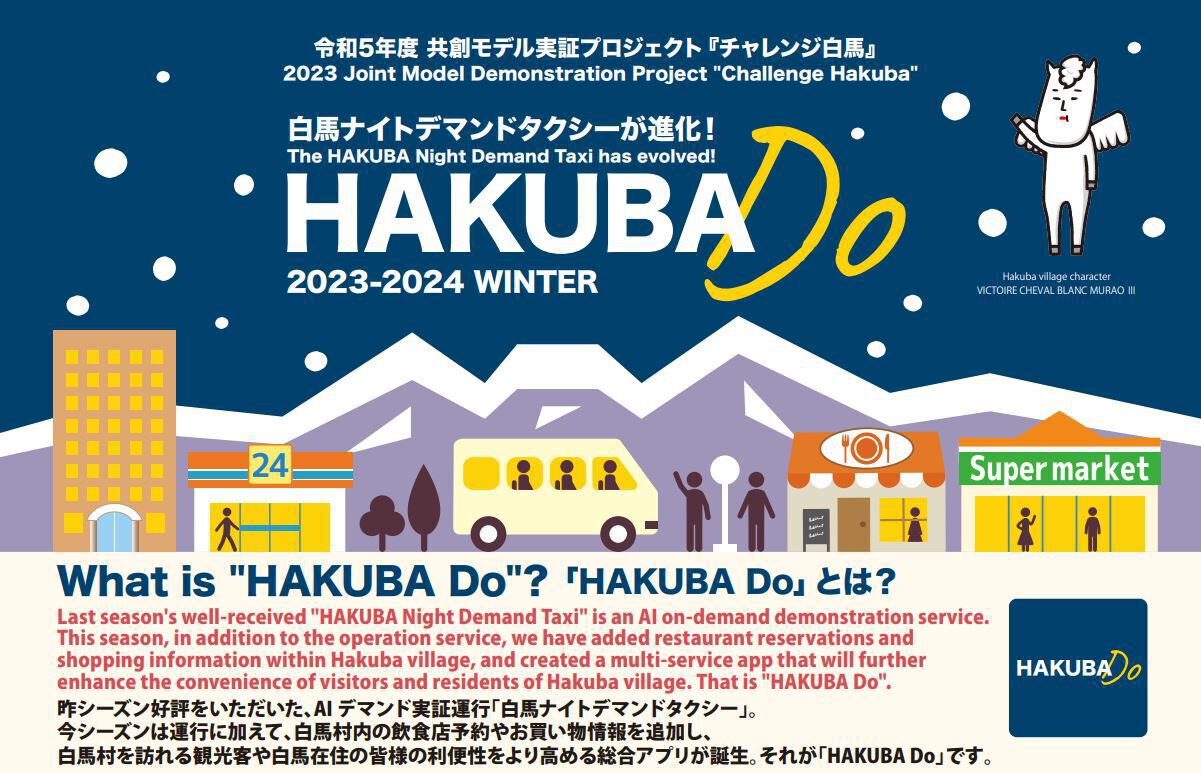 「HAKUBA DO」は武道にも使われ外国人にも人気の漢字である「道」をイメージし、信州大学の学生と一緒に議論し考案した愛称だ。白馬の道と白馬を楽しむ心、2つの意味を込めている。飲食や買い物などの目的と併せた交通サービスに発展させることで、白馬村内の回遊促進•産業振興を推進し、住民と観光客それぞれが利用しやすい料金体系を実現する。次年度以降は新しい住民向け交通サービスへの展開も予定している。