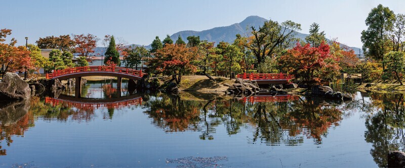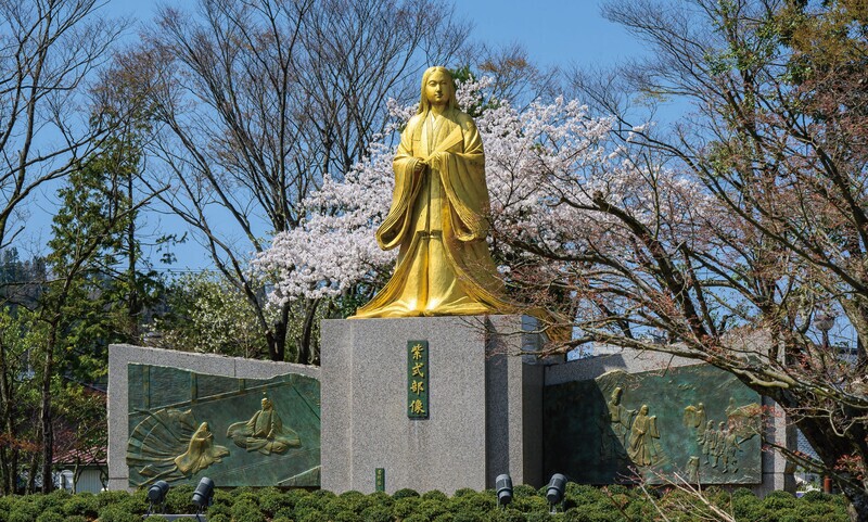 全国で唯一の寝殿造庭園である「紫式部公園」と公園内で金色に輝く「紫式部像」