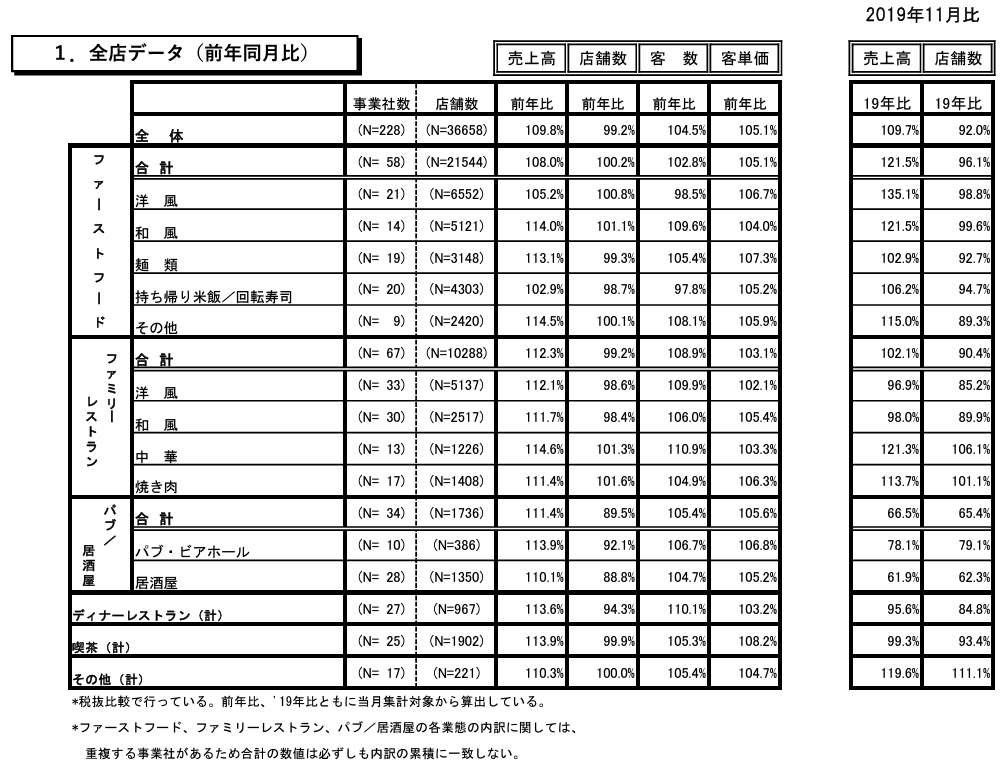 11月の全体概況は、コロナ禍後の消費者の外食意欲が継続して回復しており、忘年会シーズンに向けて宴会需要が徐々に増加、加えてインバウンド需要も好調で、外食全体の売上げは前年比19年比ともに109%を上回った。特に人の集まる駅前立地など繁華街の店が好調だった。しかし引き続く物価高の中、消費者の節約志向も強まっており、一部では値下げをアピールする価格政策に戻って集客を図るところも見られた。