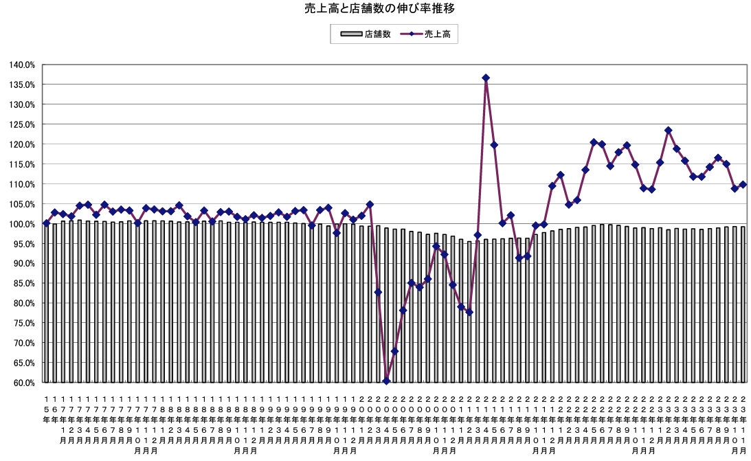 「和風」は引き続き定番の冬季メニューが好調で、売上げ114.0%となった。「麺類」も冬季限定メニューなどが好調で113.1%。「持ち帰り米飯/回転寿司」は、「回転寿司」が都市中心部の店舗の好調に支えられ、売上げ102.9%となった。「その他」はアイスクリーム、カレーともにキャンペーンメニューが好調で、売上げ114.5%となった。