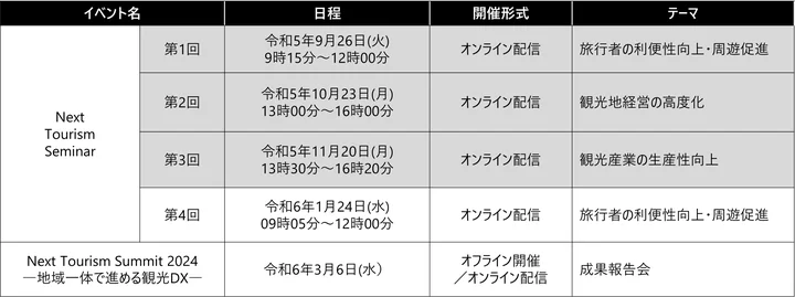 観光DX推進プロジェクトでは、観光DXに取り組むDMOや自治体等を対象として開催するオンラインセミナー”Next Tourism Seminar 2023”について、第4回の参加者募集を開始した。