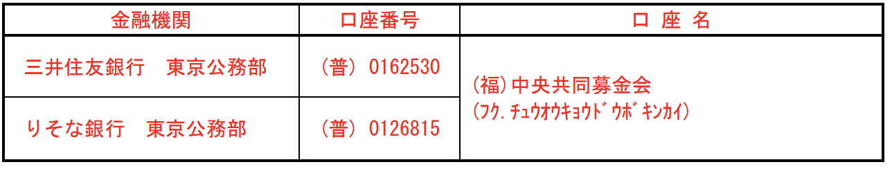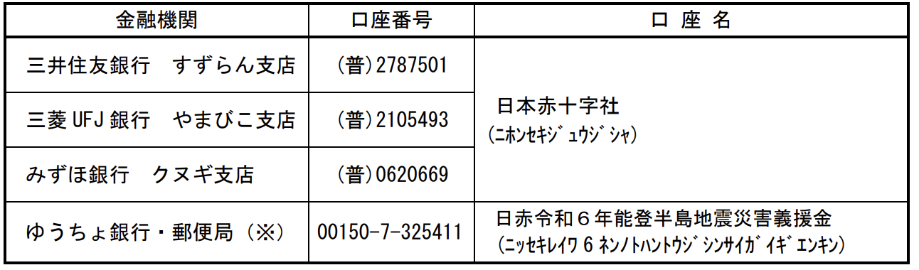 次の金融機関口座へ、直接振り込んでいただくことも可能(※)。詳しくは日本赤十字社の義援金ウェブサイト( https://www.jrc.or.jp/contribute/help/20240104/)又は共同募金会の義援金ウェブサイト( https://www.akaihane.or.jp/saigai-news/gienkin/34975/)を御覧下さい。※御利用の金融機関によっては別途振込手数料がかかる場合がある。また口座は増設されることがある。