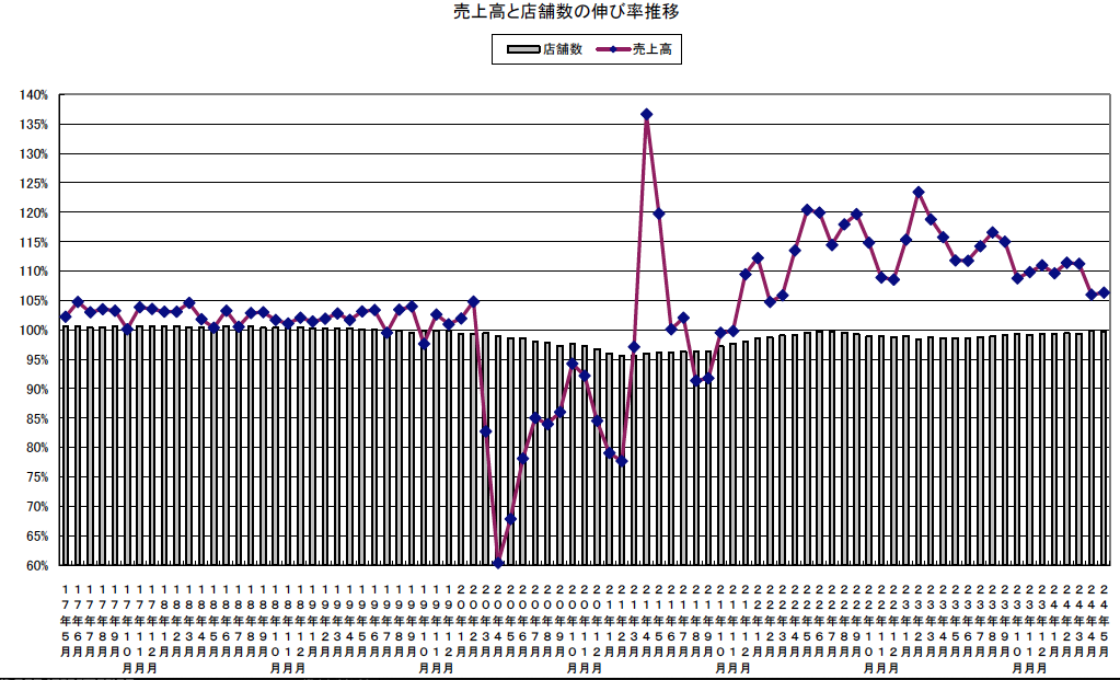 業態別概況ではファーストフード業態(FF)は引き続き好調で、売上げ106.1%、19年比では127.7%となった。「洋風」は連休明けの割引率の高い販促が奏功し、売上げは104.0%。「和風」は連休後に勢いが弱まるも、モバイルクーポンなどで挽回し、売上げは110.7%となった。