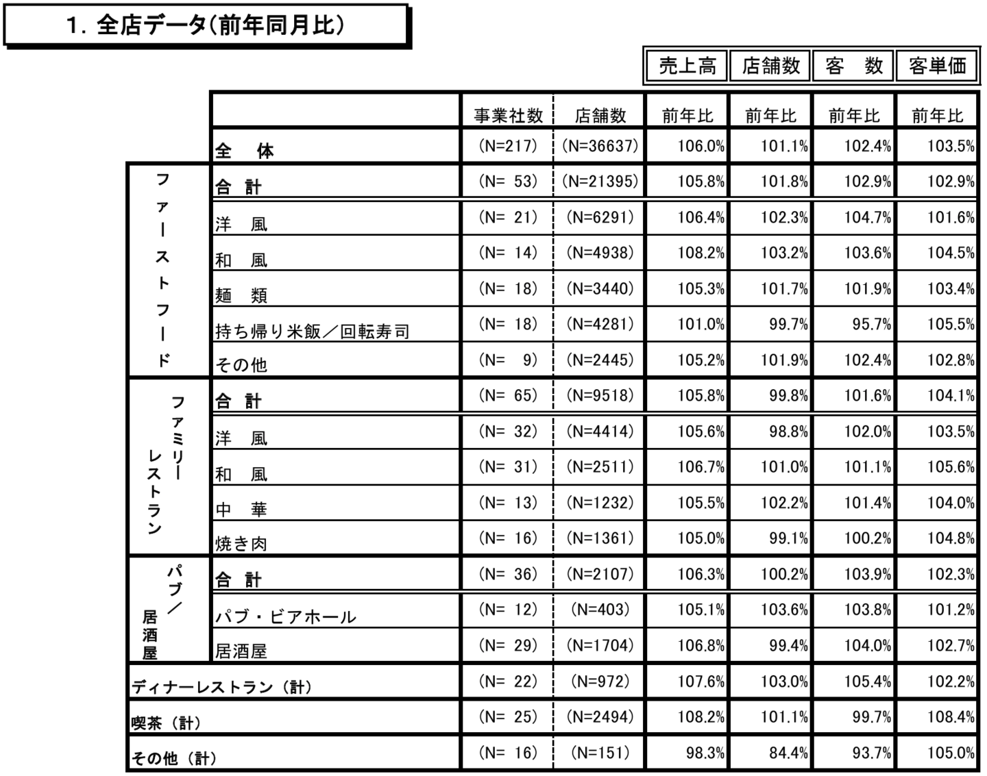 ファミリーレストラン業態(FR)の全体売上げは105.8%となった。洋風は前年のお得なキャンペーンの反動で客数が落ちたところもあったが、低価格業態の集客好調が続き、売上げ105.6%。和風は年末を中心にロードサイド店で家族客が増え、客単価の上昇とあいまって、売上げ106.7%。中華はお得なランチメニューと店舗増で、売上げは105.5%となった。焼き肉は年末の休みを中心に集客し、売上げは105.0%となった。