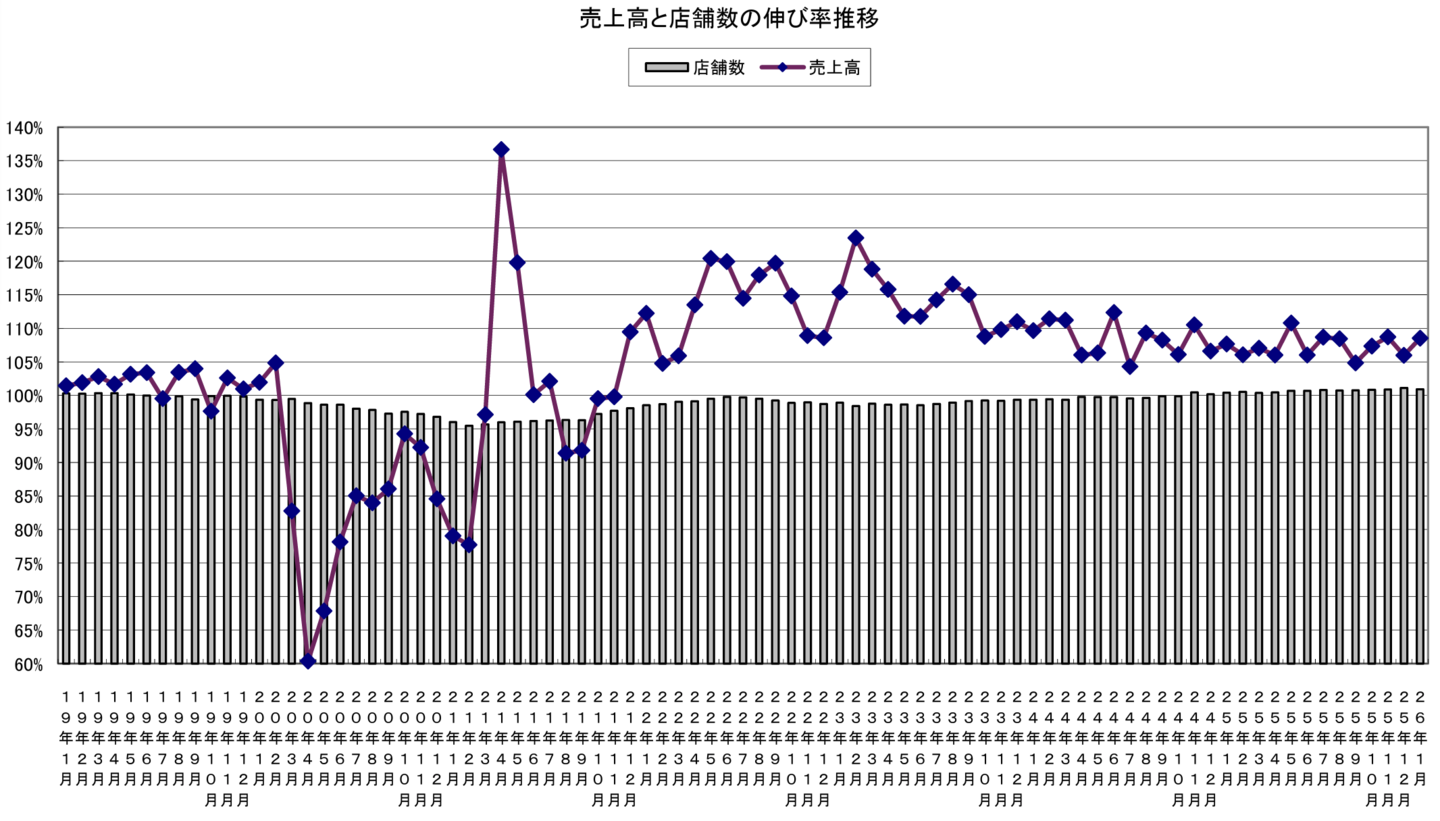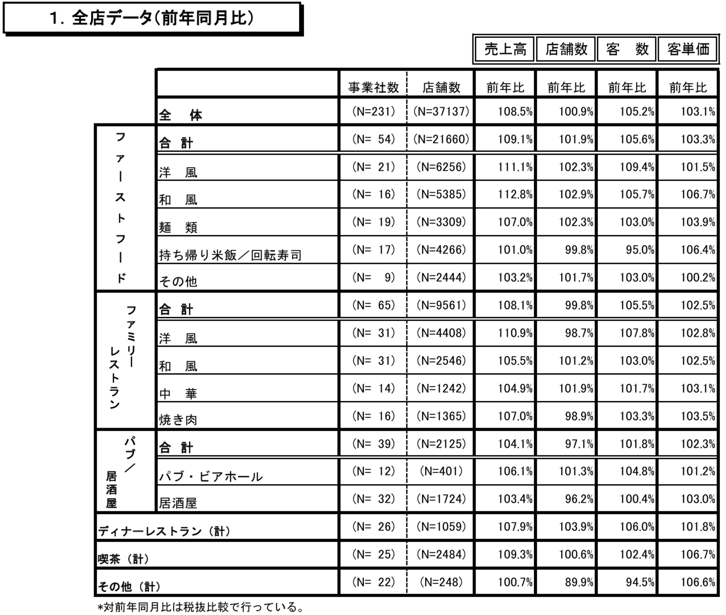 業態別概況では、ファーストフード業態のFFは、全体売上げ109.1%となった。洋風は期間限定商品や各種キャンペーンの好調などで、売上げ111.1%となった。和風は人気商品の復活などで、売上げ112.8%となった。麺類はお得感のあるラーメン業態の堅調と、期間限定のサイズアップキャンペーンの予想以上の集客などで売上げ107.0%。