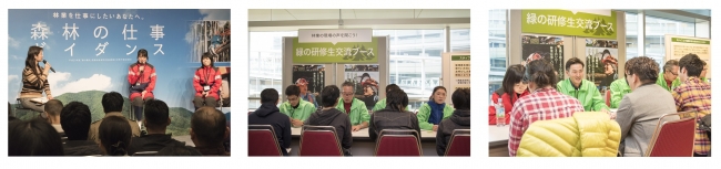 また、日本の林業の現状や「緑の雇用」事業、林業への就業の流れなどについて説明する「オリエンテーションコーナー」、総合相談コーナーとして「全国森林組合連合会ブース」も設ける。森林の担い手を目指し技術習得に励むフォレストワーカー(緑の研修生)との「交流コーナー」や、仕事の内容や生活•暮らしについて聞ける「トークショー」の他、ハローワークの協力により幅広い情報を提供する。