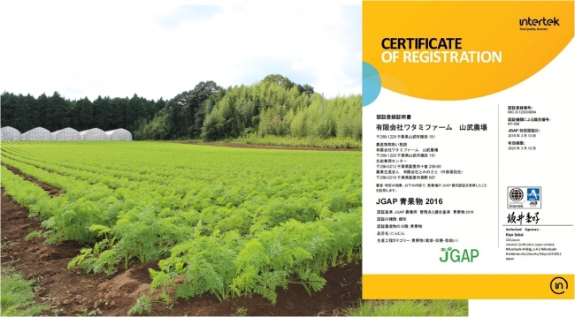 ワタミ(株)(東京都大田区、清水邦晃代表取締役社長)のグループ会社、農地所有適格法人(有)ワタミファーム(千葉県山武市、磯野健雄代表取締役社長、以下ワタミファーム)は、千葉県南房総市で運営しているワタミファーム白浜農場(早藤勝農場長、以下白浜農場)、千葉県山武市で運営しているワタミファーム山武農場(岡田拓也農場長、以下山武農場)の2農場で、インターテック•サーティフィケ―ション(株)よりJGAP認証を取得した。認証取得日は白浜農場が2月21日、山武農場が3月13日だ。ワタミファームでの認証取得は大分県臼杵市の臼杵農場と合わせて3農場となった。ワタミファームでは国内にある全農場•牧場でJGAP認証取得を目指す。