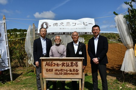 (右から)丸紅(株)飲料原料部の梶原部長、鹿児島県大島郡伊仙町の大久保町長、徳之島コーヒー生産者会の吉玉代表、味の素AGF(株)の品田社長 ※「吉」は(土のしたに口)