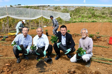 このプロジェクトは、「他にはない日本産のコーヒーを作りたい」という徳之島コーヒー生産者会の吉玉誠一代表の想いのもと、2017年6月26日に徳之島コーヒー生産者会、伊仙町役場、丸紅(株)、AGFの4者での契約締結によってスタートした。今回の苗植え式では、徳之島のビニールハウスで育った100本のコーヒーの苗がAGF®コーヒー実証農場へ植え替えられた。AGF®コーヒー実証農場の広さは約10aで、200本のコーヒーの木を育てることができる。