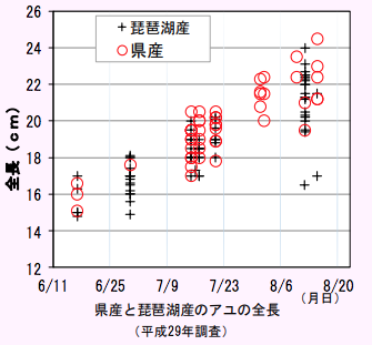 県産と琵琶湖産のアユの全長(平成29年調査)