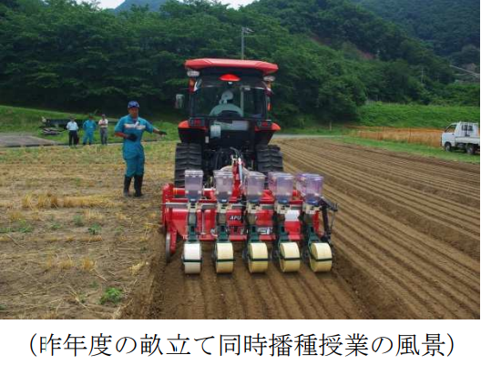授業内容はほ場の耕うんと畝立。播種を同時に行う畝立大豆同時播種機の特徴、操作方法等の実技に加え、安全な作業について学習する。ちなみに畝立とは、細⻑く直線状に土を盛り上げて栽培床(畝)を作る作業で、生育や水はけを良くする。播種とは植物の種を播くこと(種まき)。