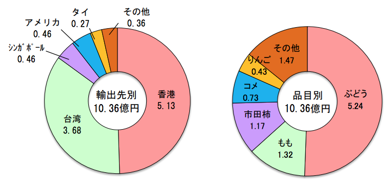 県産農産物の主要な輸出先は香港が5億 1,300万円、台湾が3億6,800万円で、この2地域で全体の85%を占めている。品目別ではぶどうが5億2,400万円と最も多く、ももが1億3,200万円、市田柿が1億1,700万円と続き、3品目で全体の75%を占めている。