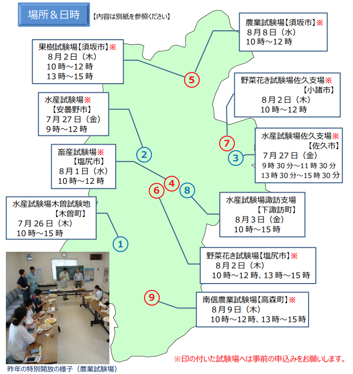 農業関係試験場、水産試験場を夏休みに特別開する。お米、くだもの、野菜、魚などについて研究している試験場を夏休みに特別開放。研究している農作物の紹介、田んぼや畑、施設や機械の見学、試食や体験コー ナーなど、楽しい企画をいっぱい用意して皆様のお越しをお待ちしている。