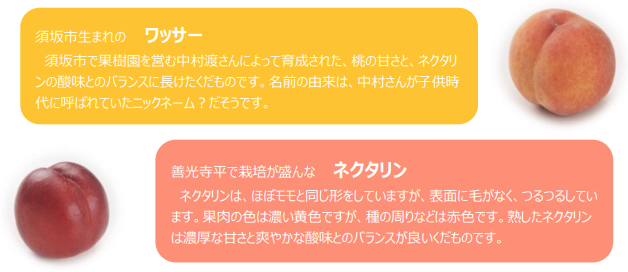 須坂市で果樹園を営む中村渡さんによって育成された桃の甘さと、ネクタリンの酸味とのバランスに長けたくだもの。名前の由来は中村さんが子供時代に呼ばれていたニックネーム?だそうだ。