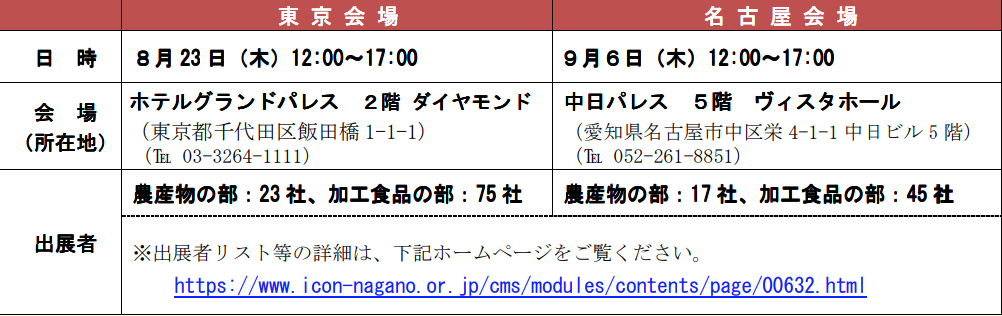 長野県及び(公財)長野県中小企業振興センターでは、大都市圏において県内の農業者及び食品