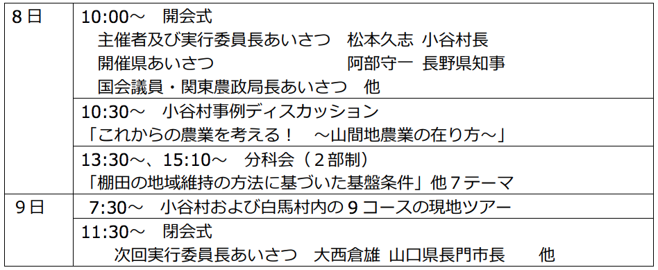 8日のスケジュールは10:00~開会式。主催者及び実行委員長挨拶は松本久志小谷村長、開催県挨拶は阿部守一長野県知事、他に国会議員、関東農政局長の挨拶。続いて10:30~小谷村事例ディスカッション 「これからの農業を考える! ~山間地農業の在り方~」。13:30~、15:10~ 分科会(2部制) 「棚田の地域維持の方法に基づいた基盤条件」他7テーマが行われる。