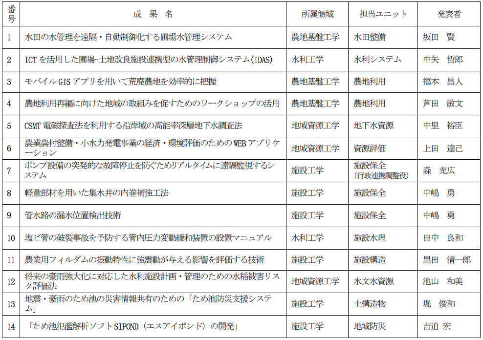 この後、14:30~15:15「ポスターセッション・インデクシング(下記14テーマを順に約3分ずつ説明)」、15:15~15:20「ポスターセッション開始の挨拶(農村工学研究部門企画管理部長)」、15:30~17:00<移動•休憩>ポスターセッションによる技術講習会及び技術相談会、17:00終了となる。