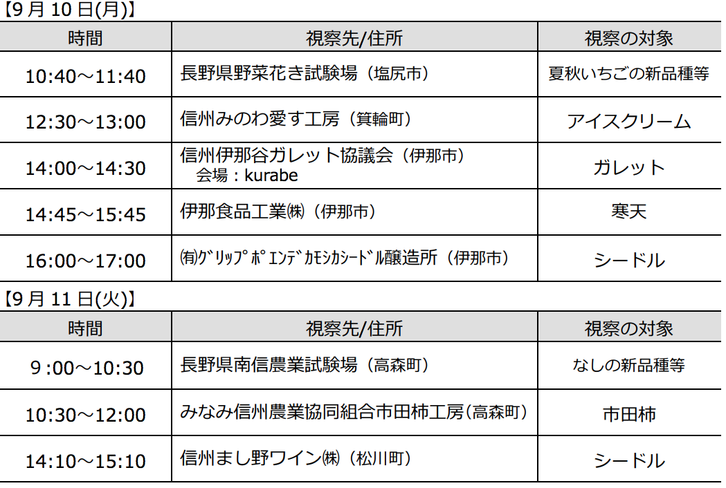 期間は9月10日(月)~11日(火)、視察する「おいしい信州ふーど」大使は鎧塚俊彦氏(Toshi Yoroizukaオーナーシェフ)。視察先は塩尻市、箕輪町、伊那市、高森町、松川町だ。