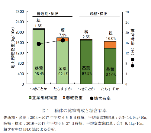 3. 晩植栽培では籾重割合が「たちすずか」の16.0%に対して2.5%と少なく、茎葉部乾物重は「たちすずか」より22%多収です(表1、図1)。