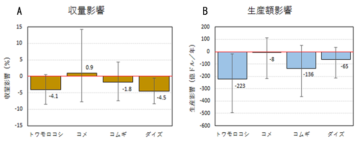50kmメッシュ毎に推定した収量影響に、2000年頃の世界の収穫面積分布と国別の生産者価格(2005~2009年の平均値)を乗じて、被害額を算出した。その結果、年間の被害額は世界全体で、トウモロコシ223億ドル、コムギ136億ドル、ダイズ65億ドルで、合計424億ドルに上った。トウモロコシの被害額は、その世界第3位の生産国であるブラジルの年生産額の2倍に相当した。