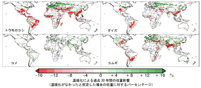 温暖化が起こっている、過去の実際の気候条件下で推定した収量と、温暖化が起きなかったという仮定の下で推定した収量を比較したところ、4種類の穀物のうちコメを除く全てで世界平均収量は、実際の気候条件下で推定したものの方が低くなった。過去の温暖化による収量の低下割合は、温暖化が起きなかった場合の収量に対して、それぞれトウモロコシ4.1%、コムギ1.8%、ダイズ4.5%であると推定された。但しコメについては、世界平均収量に有意な温暖化の影響があったとは言えなかった。