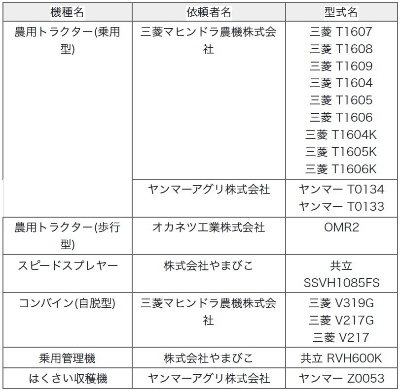 農研機構はより安全な農業機械の普及を図ることを目的に、農研機構法第14条に基づき農機具の安全性検査等を実施している。この度平成30年度第7次分として安全基準に適合となった6機種18型式について下記のとおり公表している。安全性の高い農業機械を選定する際の認証情報としてご活用くださいという。