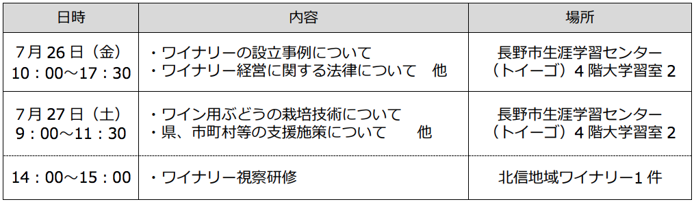 募集期限は4月22日(月)必着、受講の決定は申し込み多数の場合、申込書の内容に基づき選考の上、受講生を決定する。受講の可否については決定次第、連絡する。詳細につきましては、http://www.nagano-wine.jp/またはhttps://www.pref.nagano.lg.jp/enchiku/sangyo/nogyo/engei-suisan/wain.html掲載の開催要領をご覧いただくか、農政部園芸畜産課までお問い合せをする。