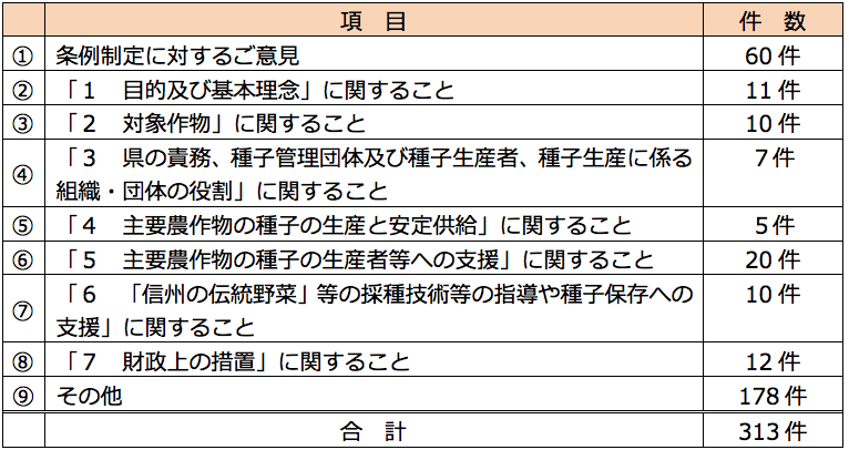 長野県主要農作物等種子条例(仮称) 骨子(案)への意見募集結果を公表 寄せられた意見の数は313件(136名) |