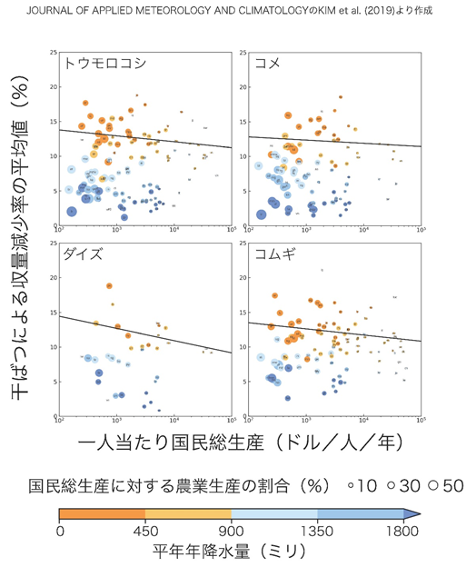国別に評価した干ばつによる収量減少率と世界銀行による一人当たり国民総生産(GDP)を用いて解析を行った結果。図中の円は平年の年降水量が900ミリ未満の場合は赤系色で、900ミリ以上の場合は青系色で示した。補助線は年降水量が900ミリ以下の国に対する回帰線で、4種類の穀物とも、一人当たりGDPの増加にともなって収量減少率が低下することがわかる。なお、円のサイズが大きいほど、国民総生産に占める農業生産の割合が大きいことを示す。円中の国コードは国際標準化機構(ISO)の国際規格3166に従っている。