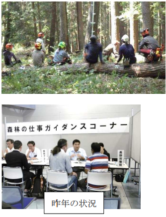 具体的には林業就業共同就職説明会では、県内の森林組合•民間林業会社(22事業体)の求人担当者が直接面談を行う。森林(もり)の仕事ガイダンスでは、林業についての質問や実際の仕事に関する相談」などに、一般財団法人長野県林業労働財団や県の担当者がお答えする。