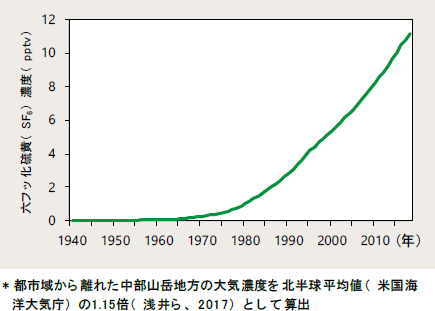 高電圧スイッチの絶縁体や変圧器に用いられる工業用ガス。1950年代以降から現在にかけて、この大気中の濃度が上昇している。SF 6 (sulfur hexafluoride)ともいう。